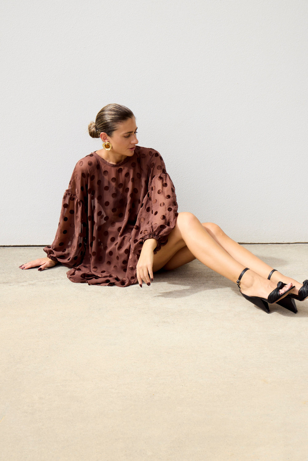 The Sheer Spot Blouse is an oversize sheer Silk blouse with a drop shoulder and uneven hemline. The cuff of the balloon sleeves are elasticised. The fit should be loose and comfortable, worn over bikinis, denim or shorts or whichever else you please.