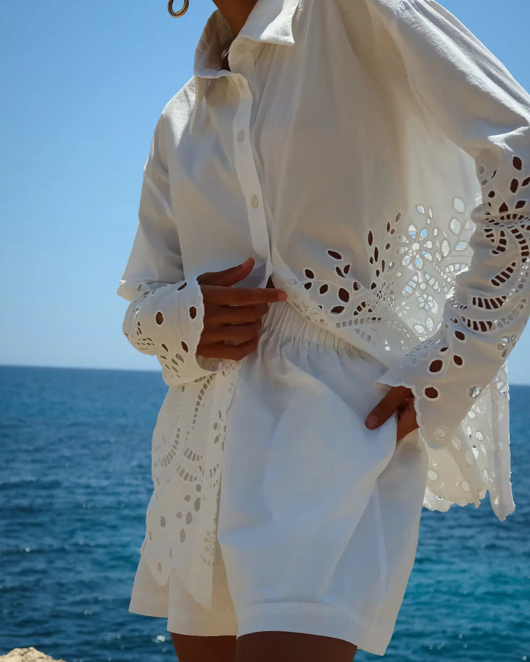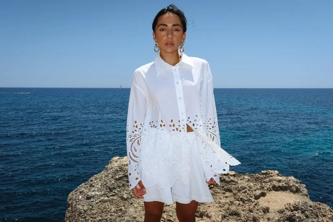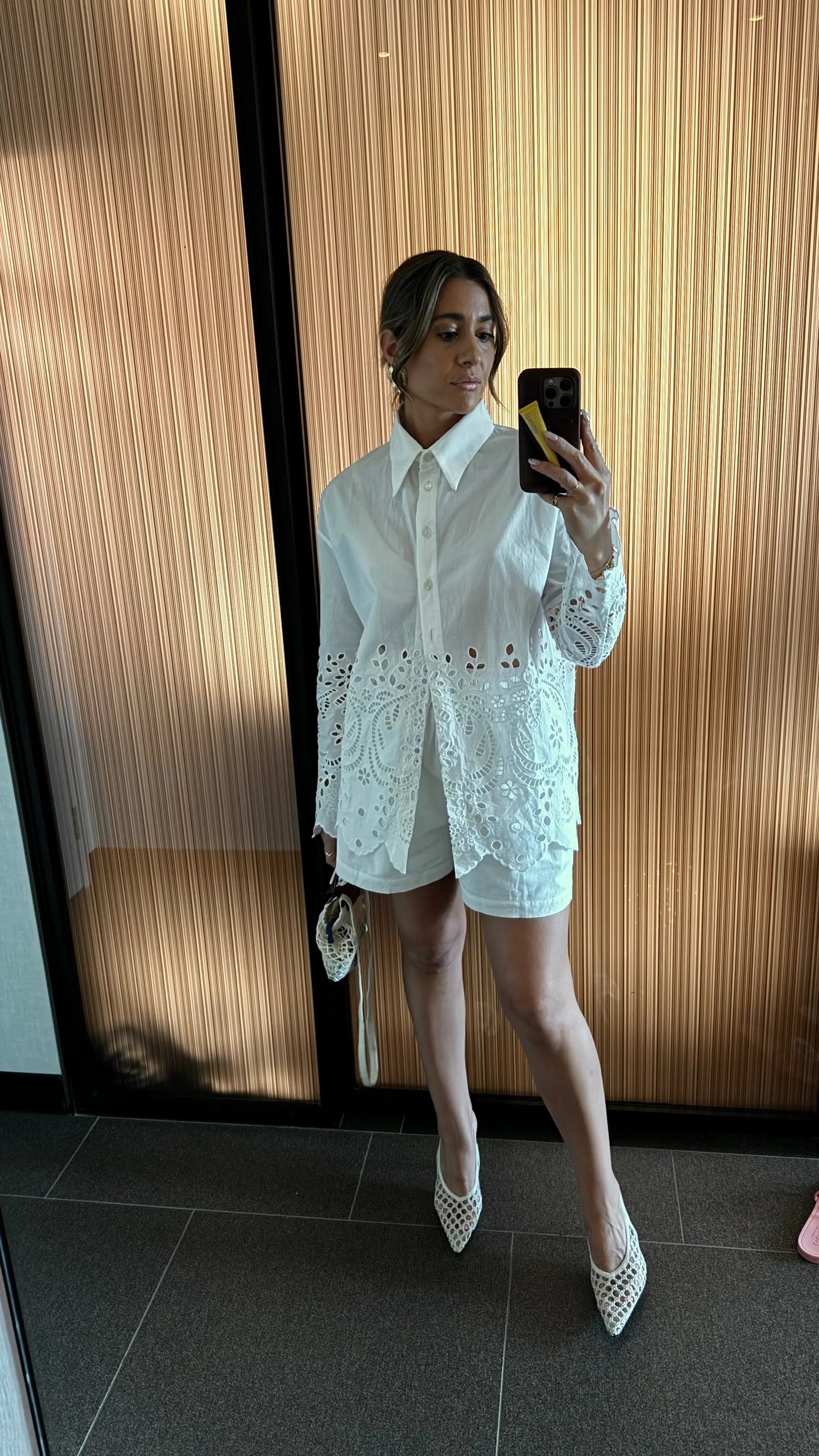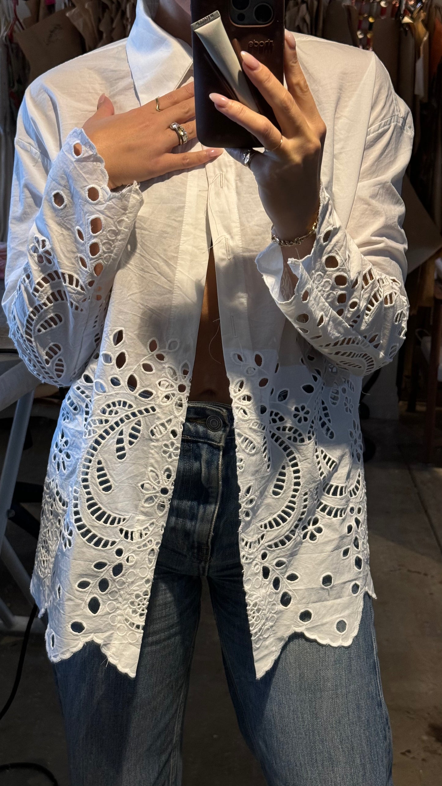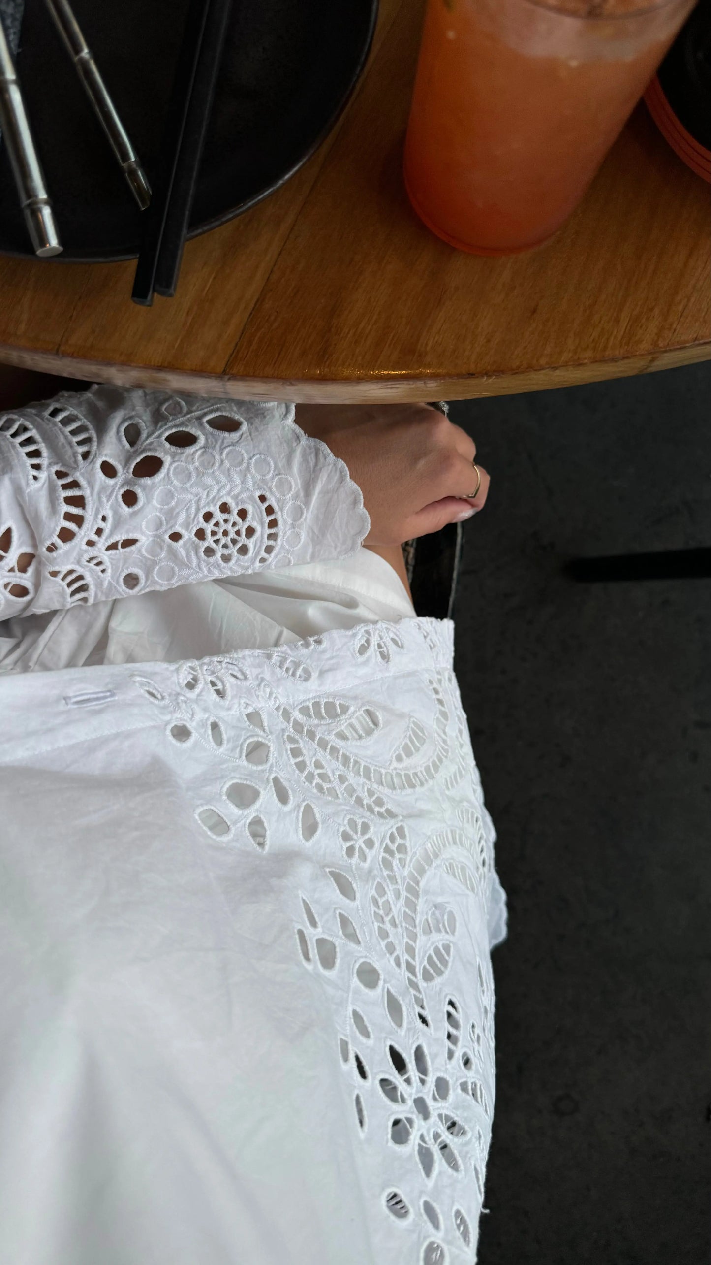 The Cotton Broderie Button-up is a semi fitted shirt with embroidered detailing at the sleeve and shirt hem. It features small buttons at the front, finishing just above the embroidered detail. The shirt features a small "Isabella Longginou" embroidered logo at the hem of the shirt.