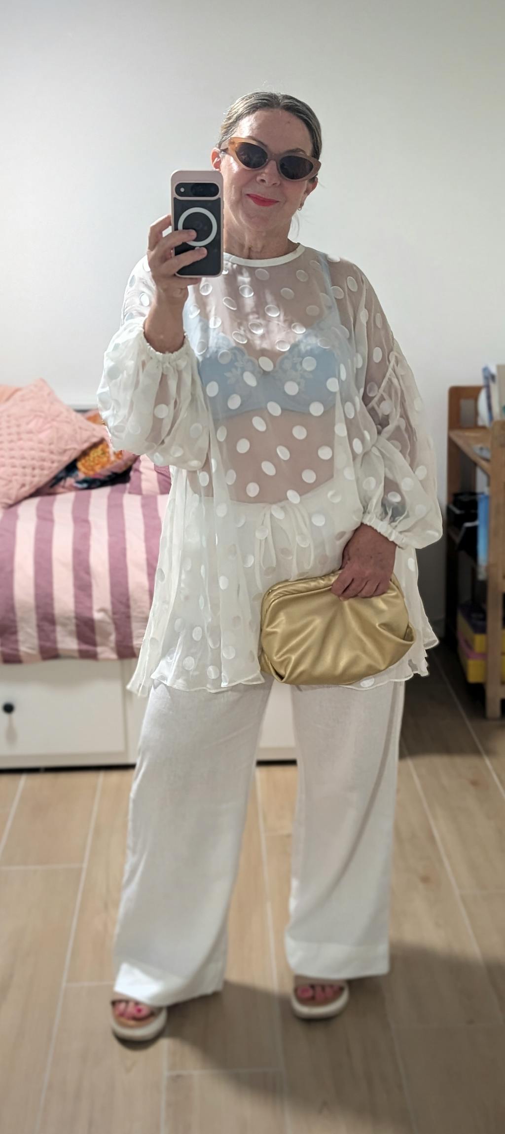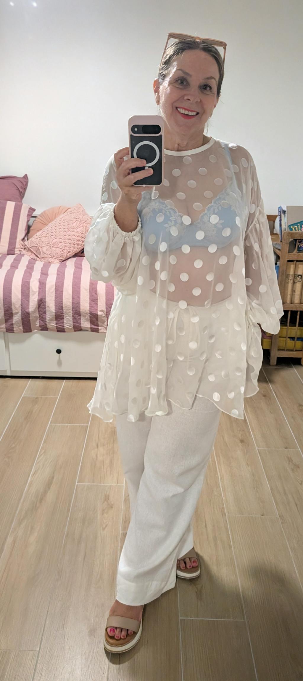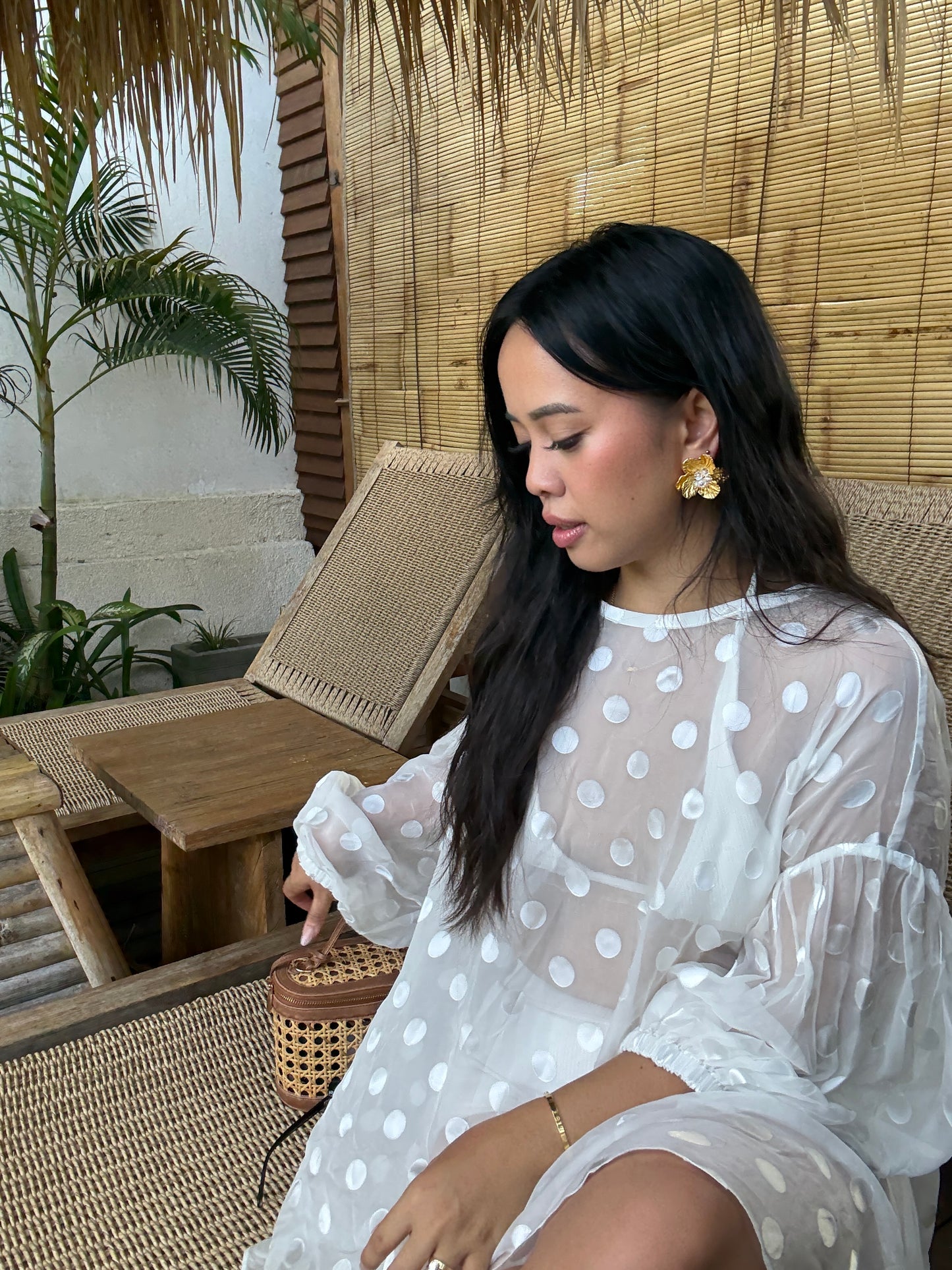 The Sheer Spot Blouse is an oversize sheer Silk blouse with a drop shoulder and uneven hemline. The cuff of the balloon sleeves are elasticised. The fit should be loose and comfortable, worn over bikinis, denim or shorts or whichever else you please.