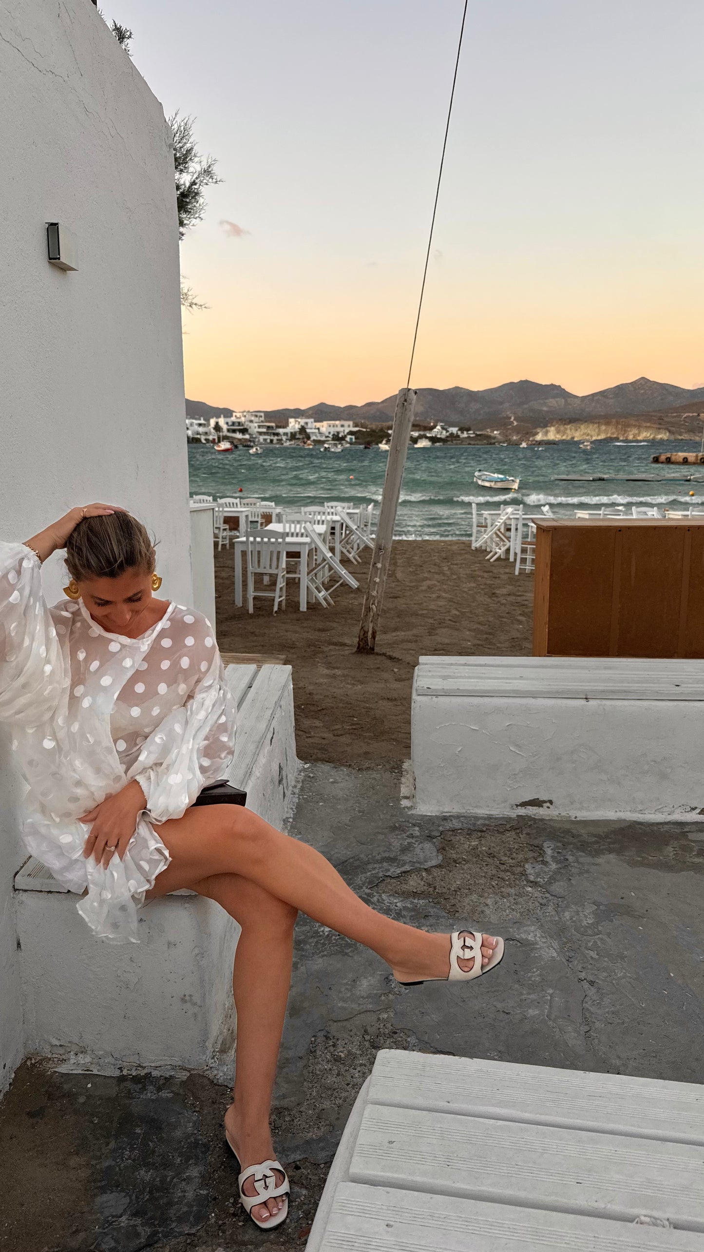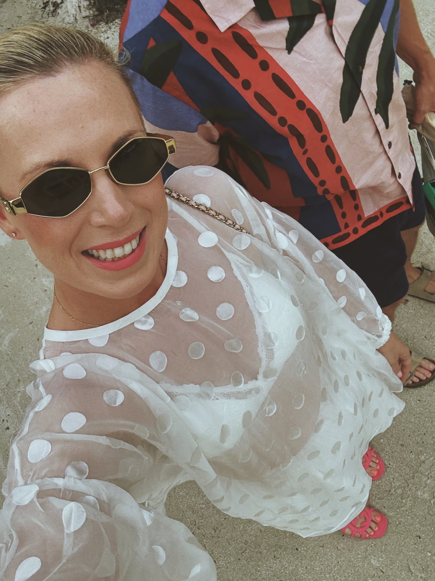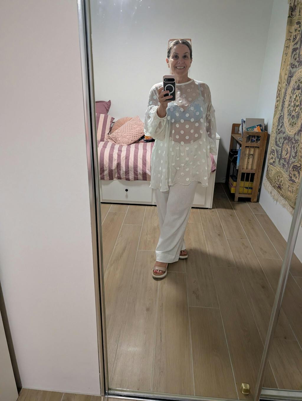 The Sheer Spot Blouse is an oversize sheer Silk blouse with a drop shoulder and uneven hemline. The cuff of the balloon sleeves are elasticised. The fit should be loose and comfortable, worn over bikinis, denim or shorts or whichever else you please.